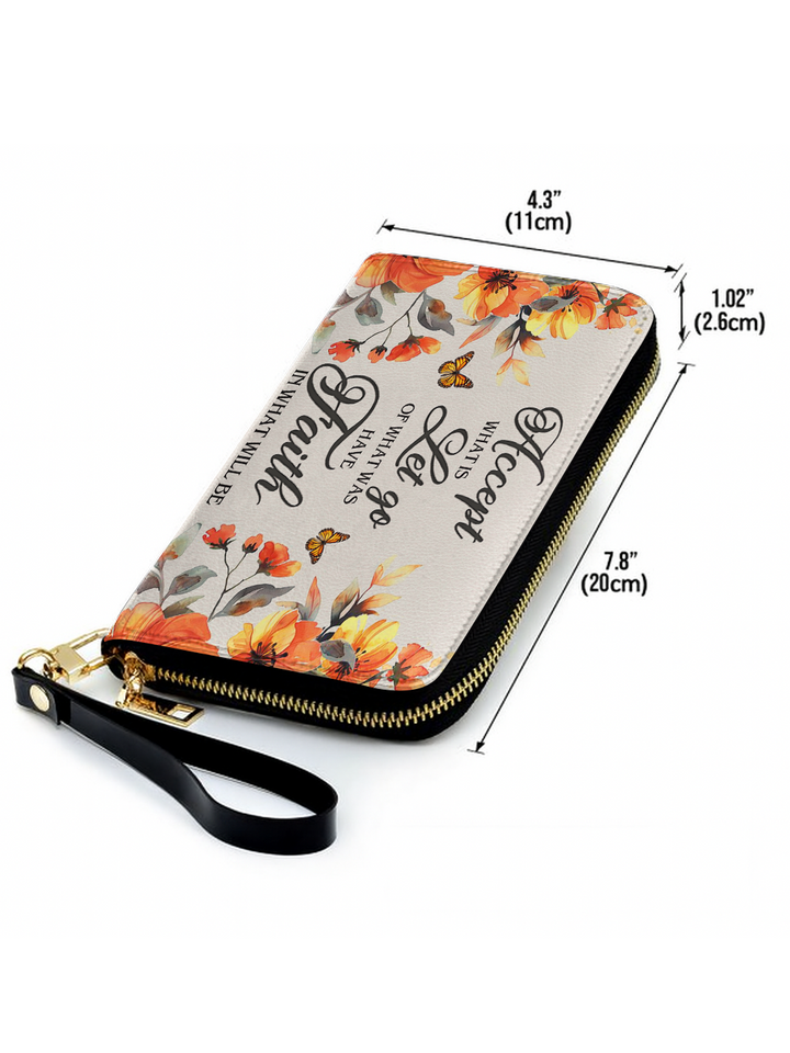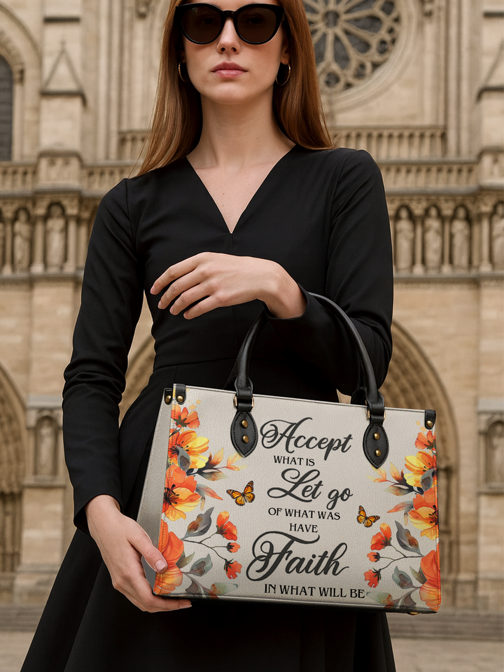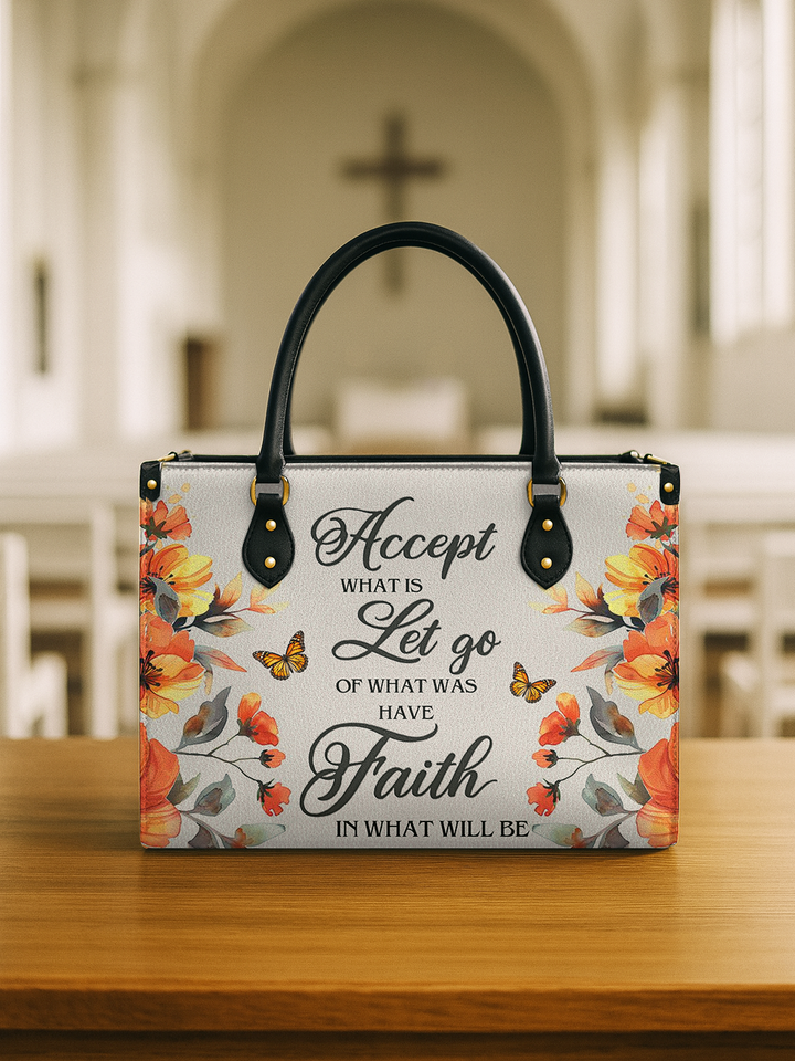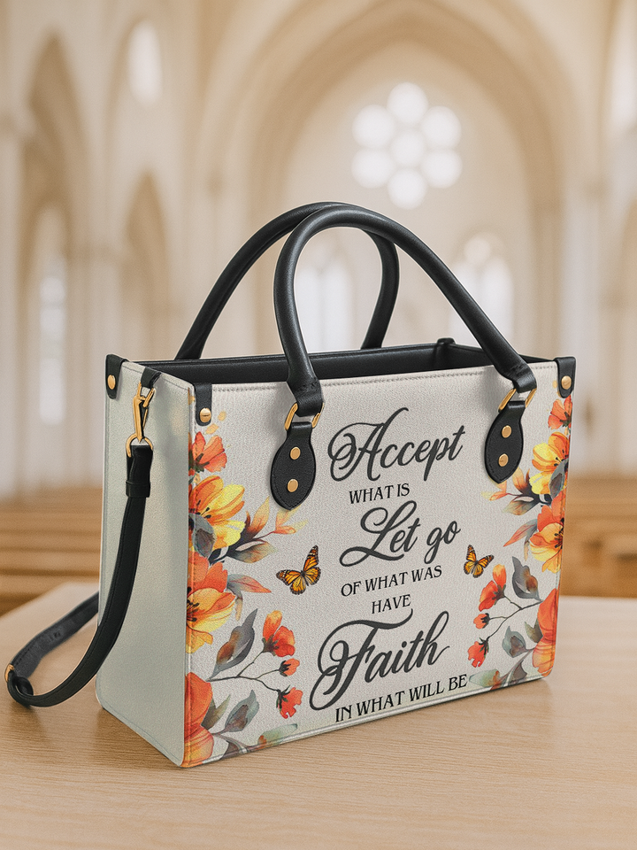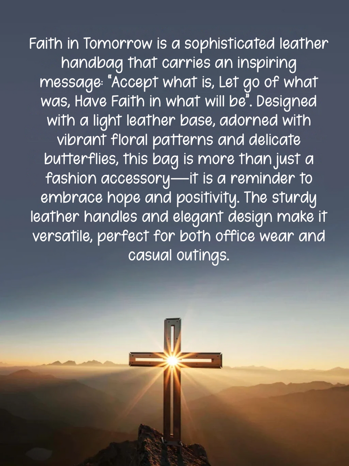 Faith in Tomorrow is a sophisticated leather handbag that carries an inspiring message: “Accept what is, Let go of what was, Have Faith in what will be”. Designed with a light leather base, adorned with vibrant floral patterns and delicate butterflies, this bag is more than just a fashion accessory—it is a reminder to embrace hope and positivity. The sturdy leather handles and elegant design make it versatile, perfect for both office wear and casual outings.