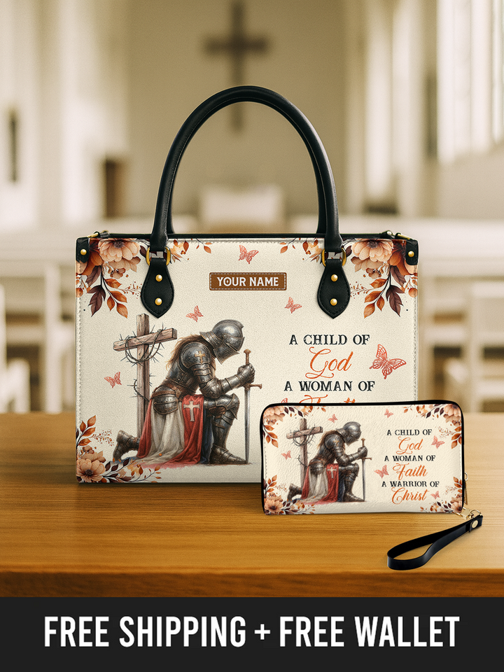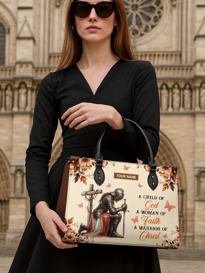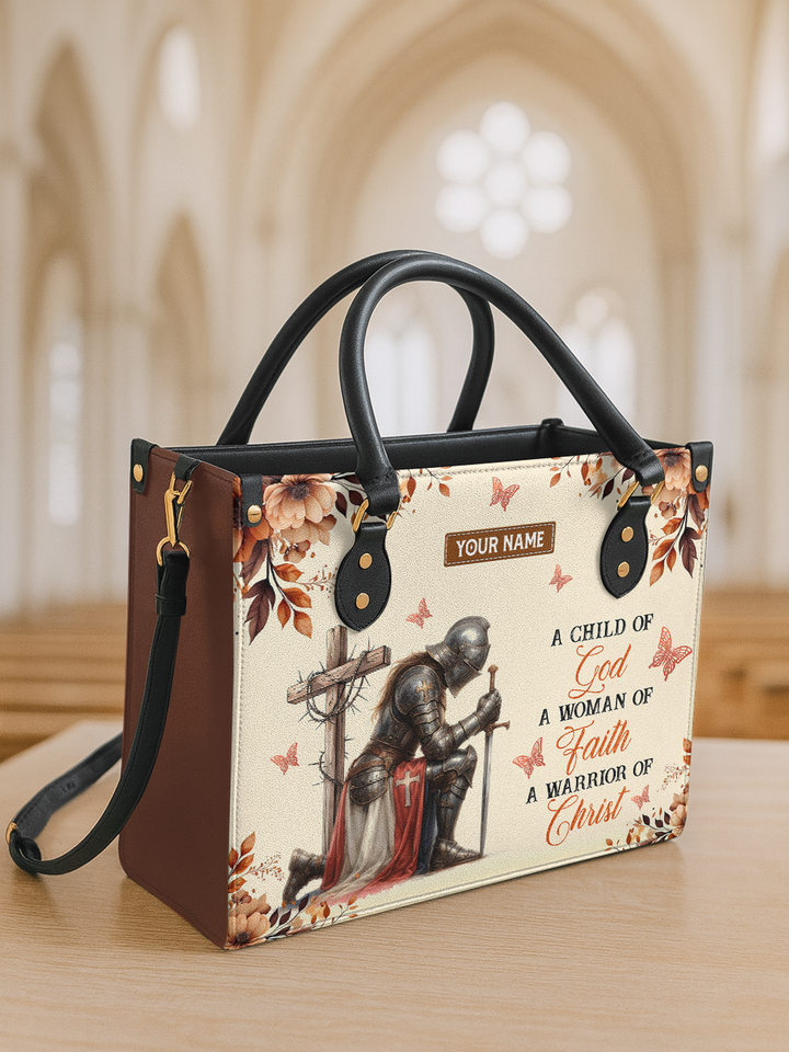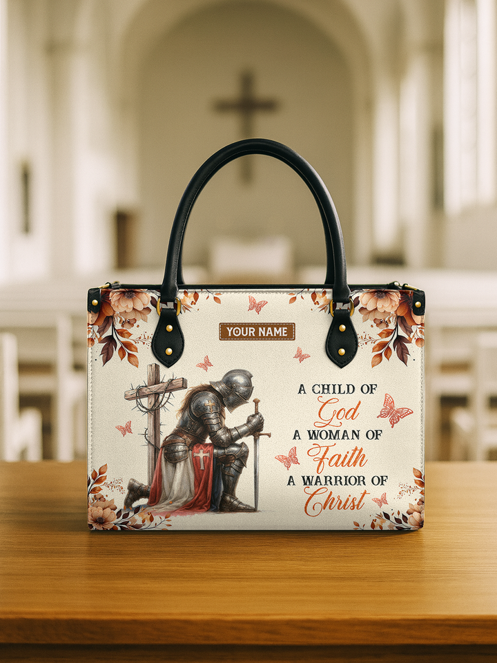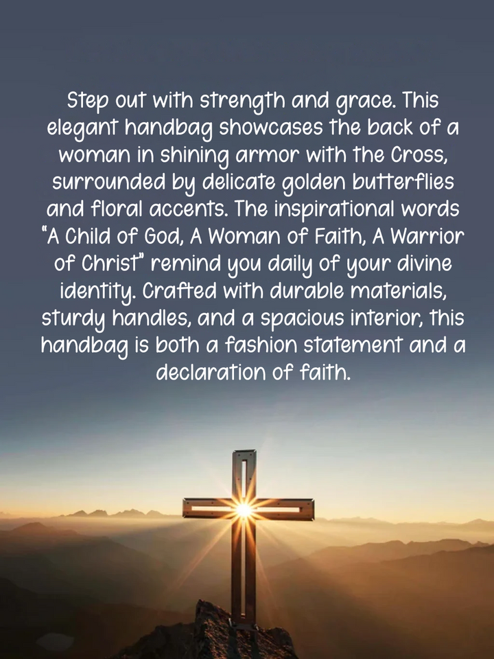 Step out with strength and grace. This elegant handbag showcases the back of a woman in shining armor with the Cross, surrounded by delicate golden butterflies and floral accents. The inspirational words “A Child of God, A Woman of Faith, A Warrior of Christ” remind you daily of your divine identity. Crafted with durable materials, sturdy handles, and a spacious interior, this handbag is both a fashion statement and a declaration of faith.