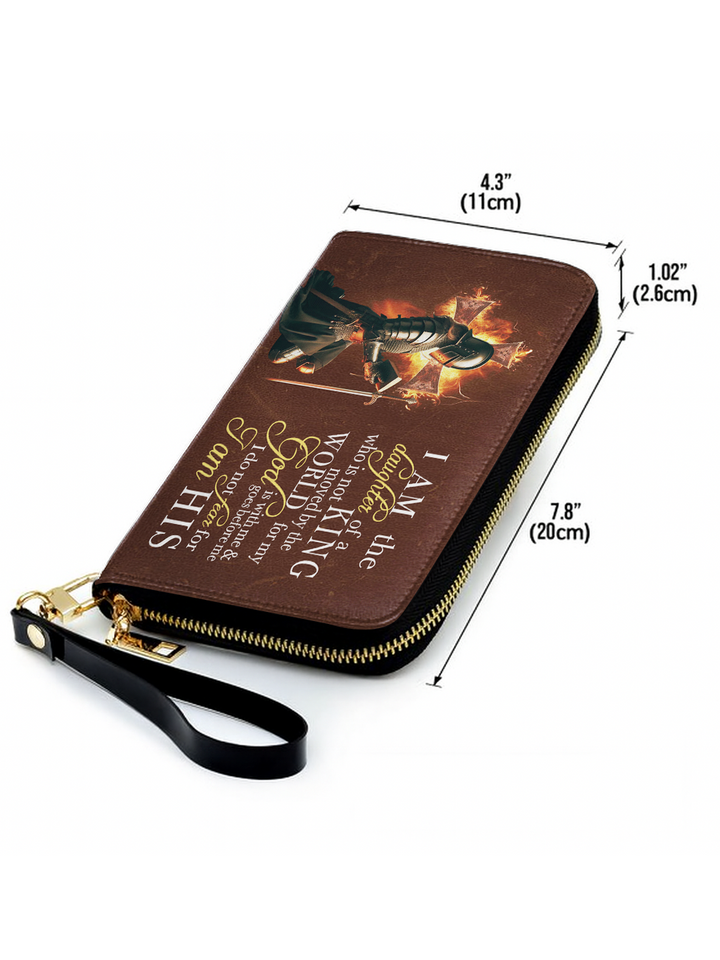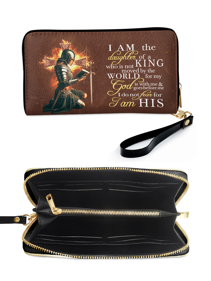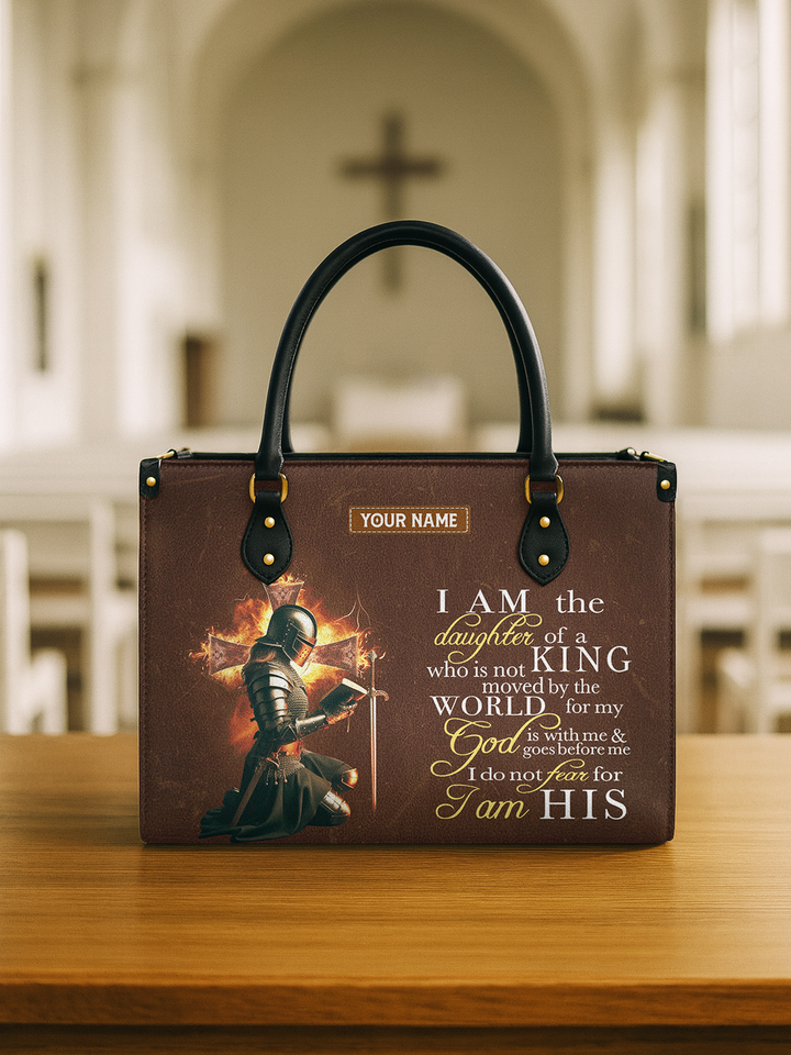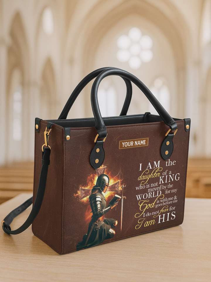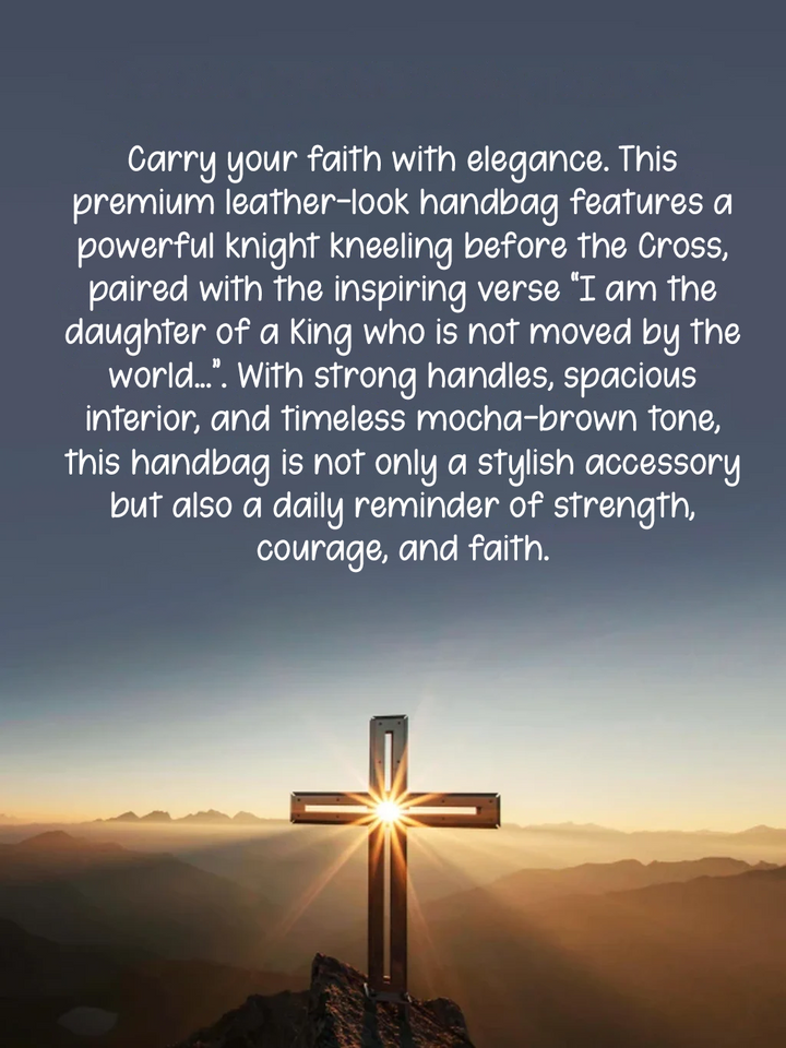 Carry your faith with elegance. This premium leather-look handbag features a powerful knight kneeling before the Cross, paired with the inspiring verse “I am the daughter of a King who is not moved by the world...”. With strong handles, spacious interior, and timeless mocha-brown tone, this handbag is not only a stylish accessory but also a daily reminder of strength, courage, and faith.