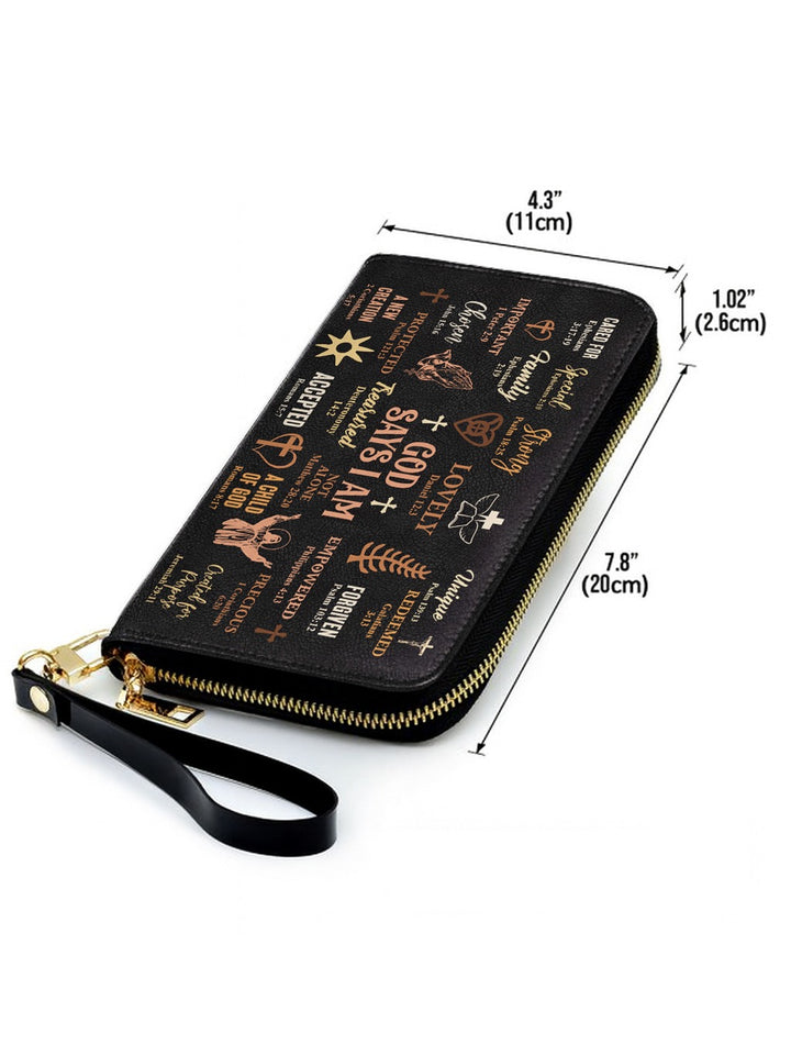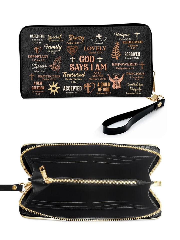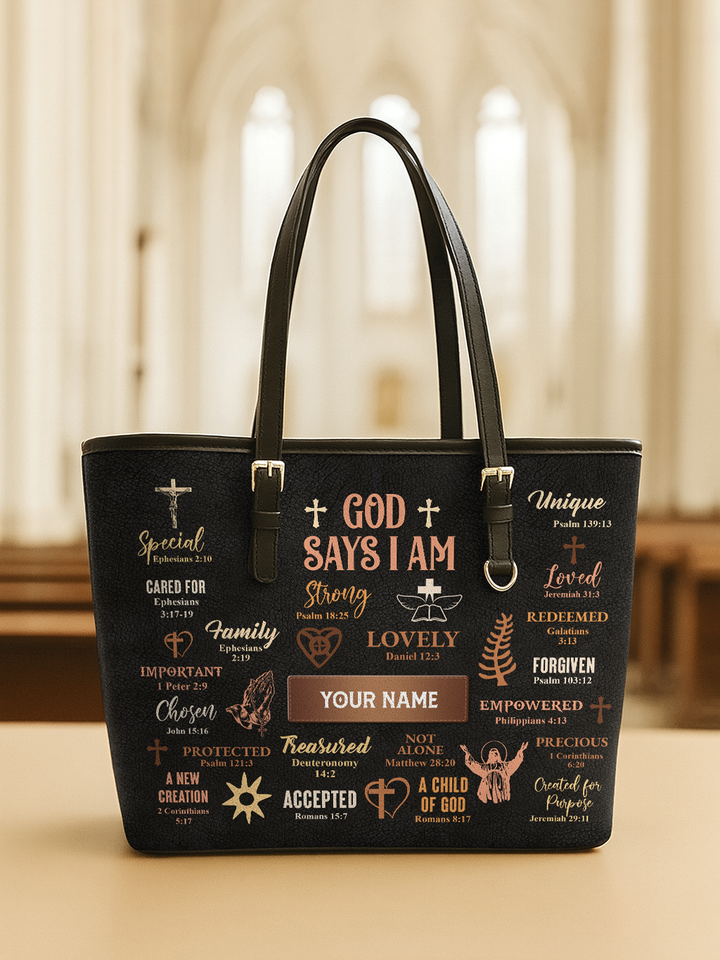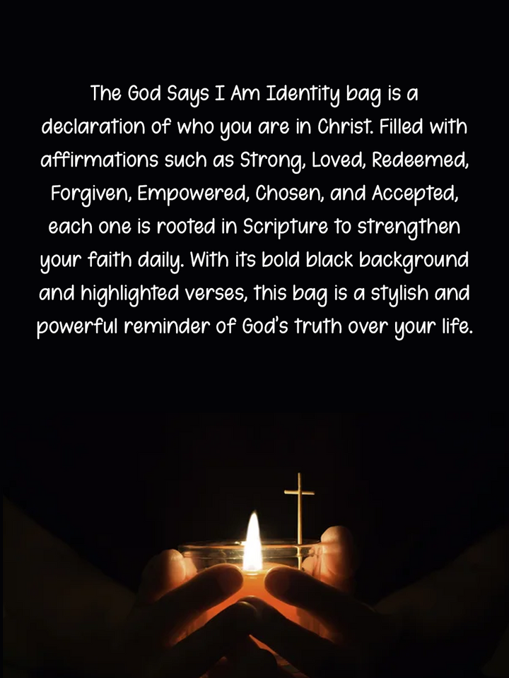 The God Says I Am Identity bag is a declaration of who you are in Christ. Filled with affirmations such as Strong, Loved, Redeemed, Forgiven, Empowered, Chosen, and Accepted, each one is rooted in Scripture to strengthen your faith daily. With its bold black background and highlighted verses, this handbag is a stylish and powerful reminder of God’s truth over your life.
