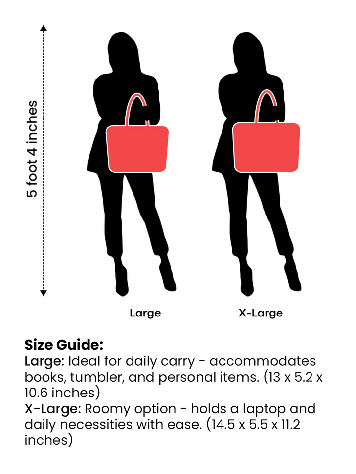 - Large: Ideal for daily carry - accommodates books, tumbler, and personal items. (13 x 5.2 x 10.6 inches)