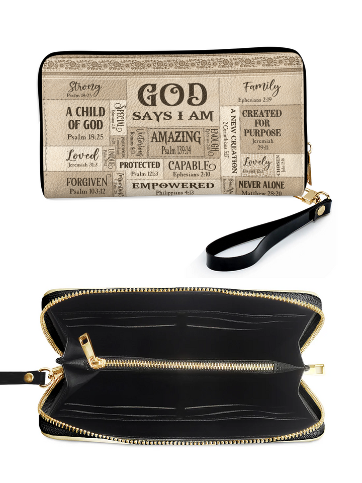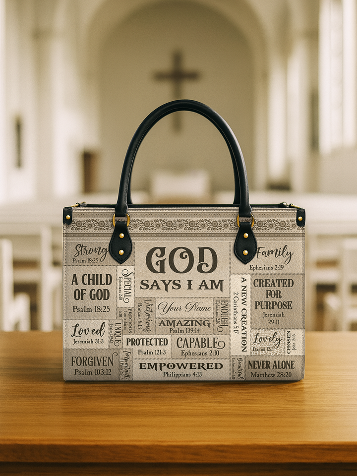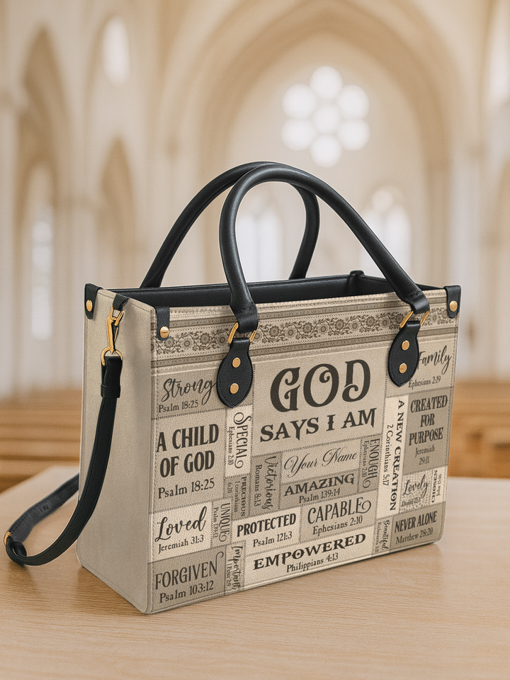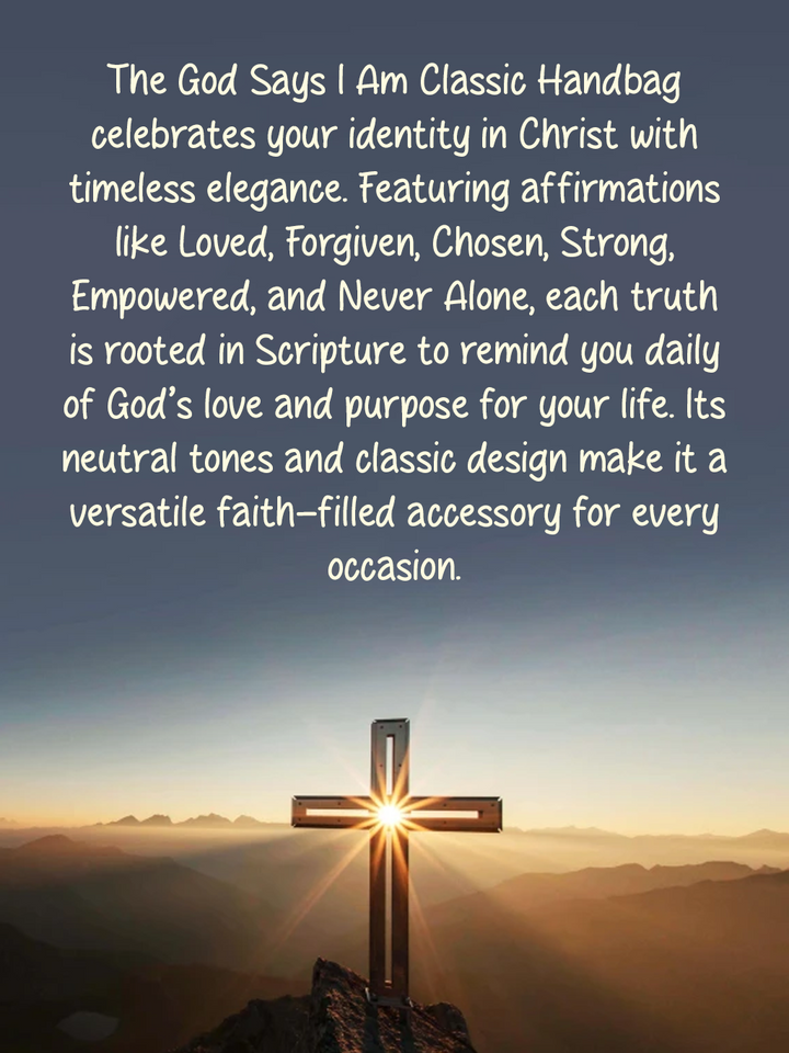 The God Says I Am Classic Handbag celebrates your identity in Christ with timeless elegance. Featuring affirmations like Loved, Forgiven, Chosen, Strong, Empowered, and Never Alone, each truth is rooted in Scripture to remind you daily of God’s love and purpose for your life. Its neutral tones and classic design make it a versatile faith-filled accessory for every occasion.