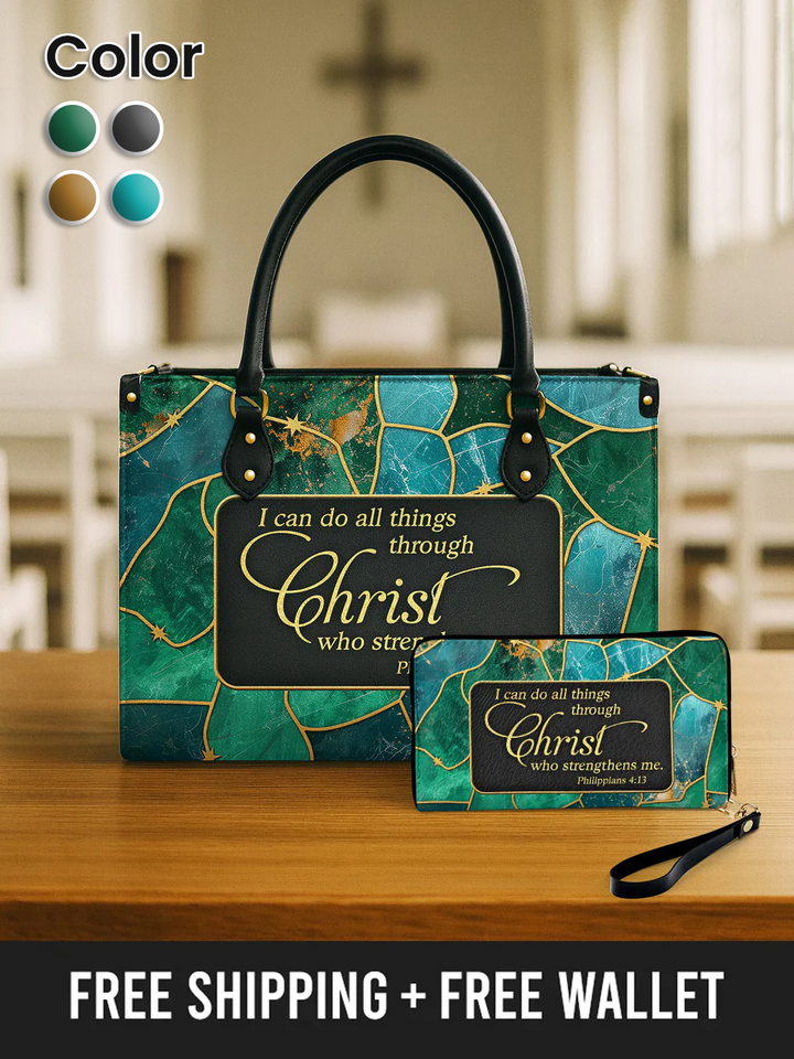 Strength in Christ Handbag is a bold declaration of strength and faith. Featuring the powerful verse from Philippians 4:13: “I can do all things through Christ who strengthens me,” this handbag serves as a daily encouragement to trust in God’s power. With its radiant emerald-toned design and elegant lettering, it reflects resilience, hope, and the unshakable assurance that in Christ, all things are possible.