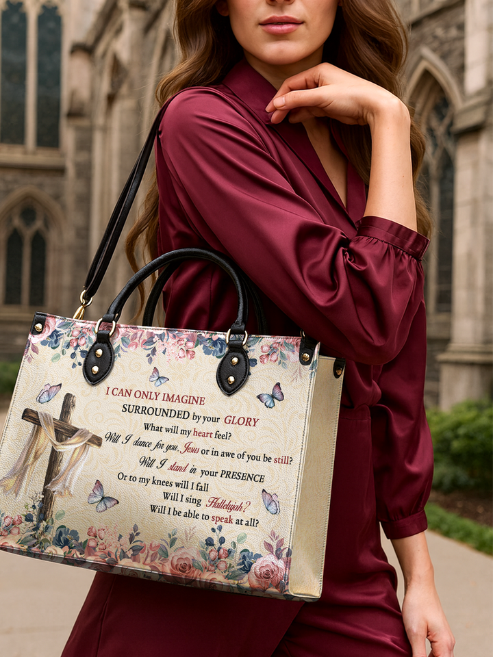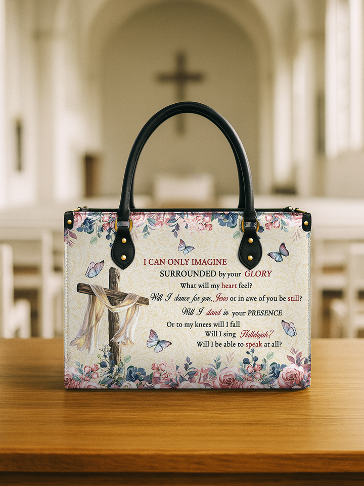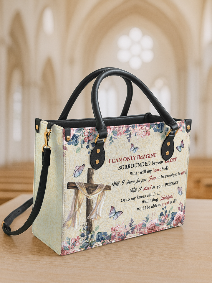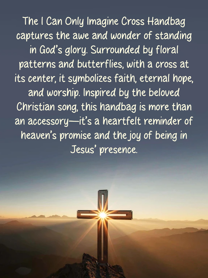 The I Can Only Imagine Cross Handbag captures the awe and wonder of standing in God’s glory. Surrounded by floral patterns and butterflies, with a cross at its center, it symbolizes faith, eternal hope, and worship. Inspired by the beloved Christian song, this handbag is more than an accessory—it’s a heartfelt reminder of heaven’s promise and the joy of being in Jesus’ presence.