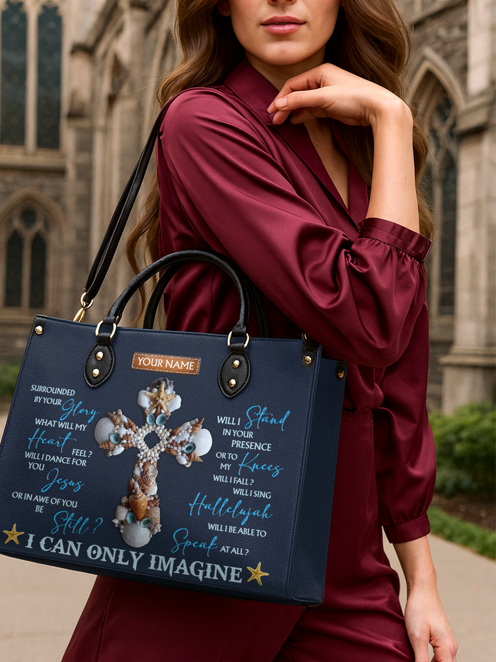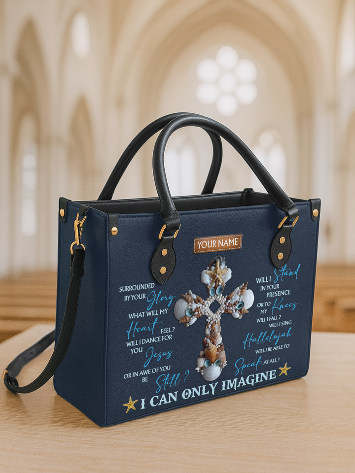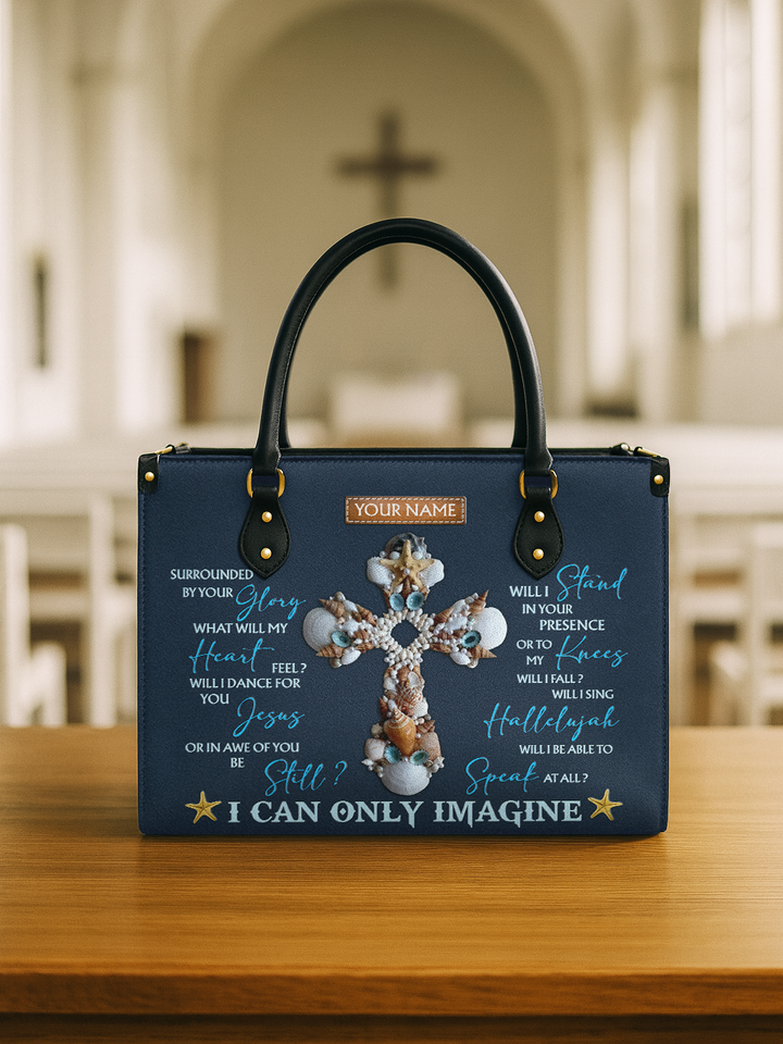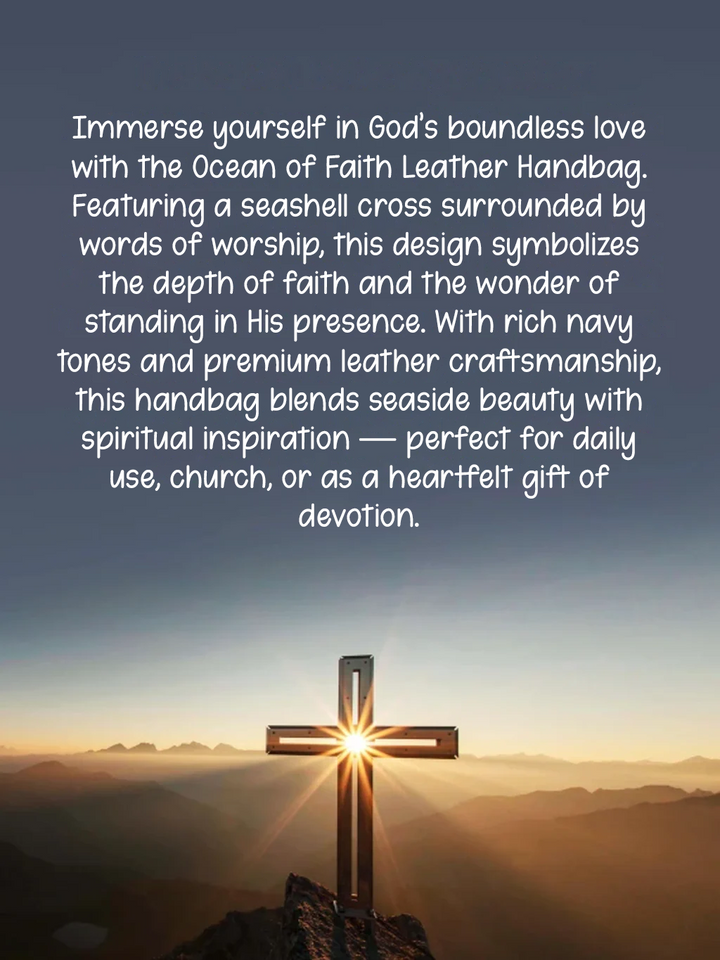 Immerse yourself in God’s boundless love with the Ocean of Faith Leather Handbag. Featuring a seashell cross surrounded by words of worship, this design symbolizes the depth of faith and the wonder of standing in His presence. With rich navy tones and premium leather craftsmanship, this handbag blends seaside beauty with spiritual inspiration — perfect for daily use, church, or as a heartfelt gift of devotion.