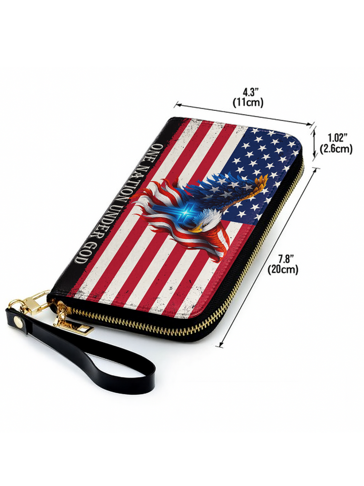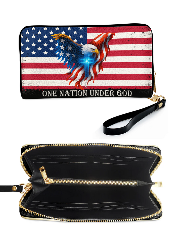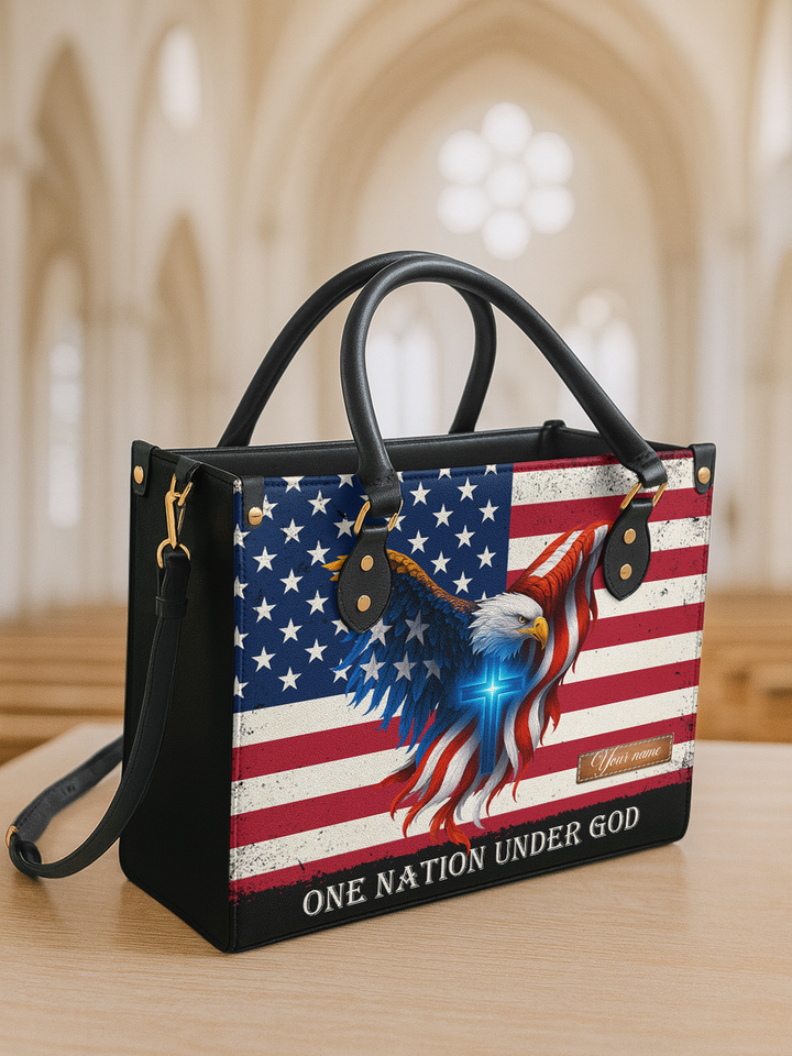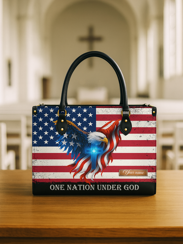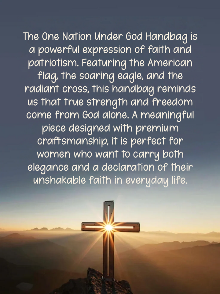 The One Nation Under God Handbag is a powerful expression of faith and patriotism. Featuring the American flag, the soaring eagle, and the radiant cross, this handbag reminds us that true strength and freedom come from God alone. A meaningful piece designed with premium craftsmanship, it is perfect for women who want to carry both elegance and a declaration of their unshakable faith in everyday life.