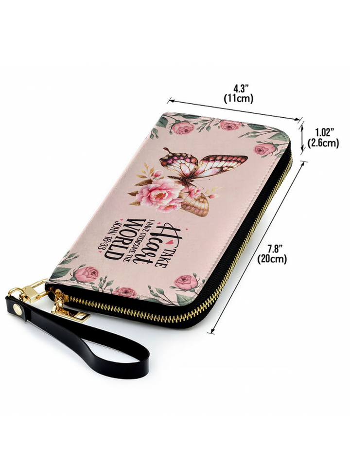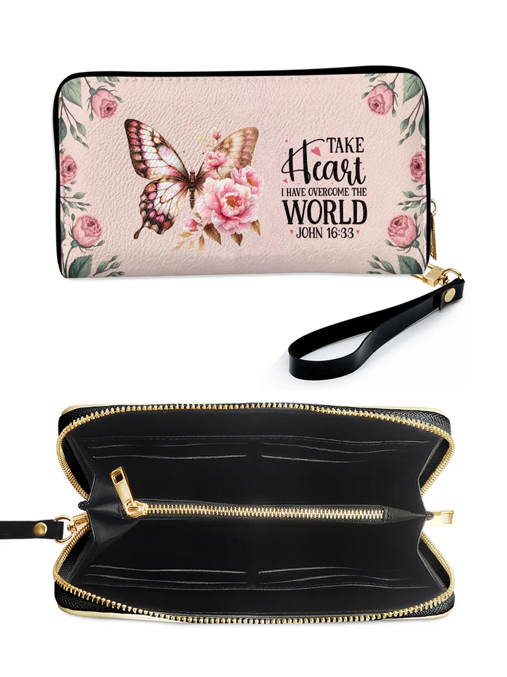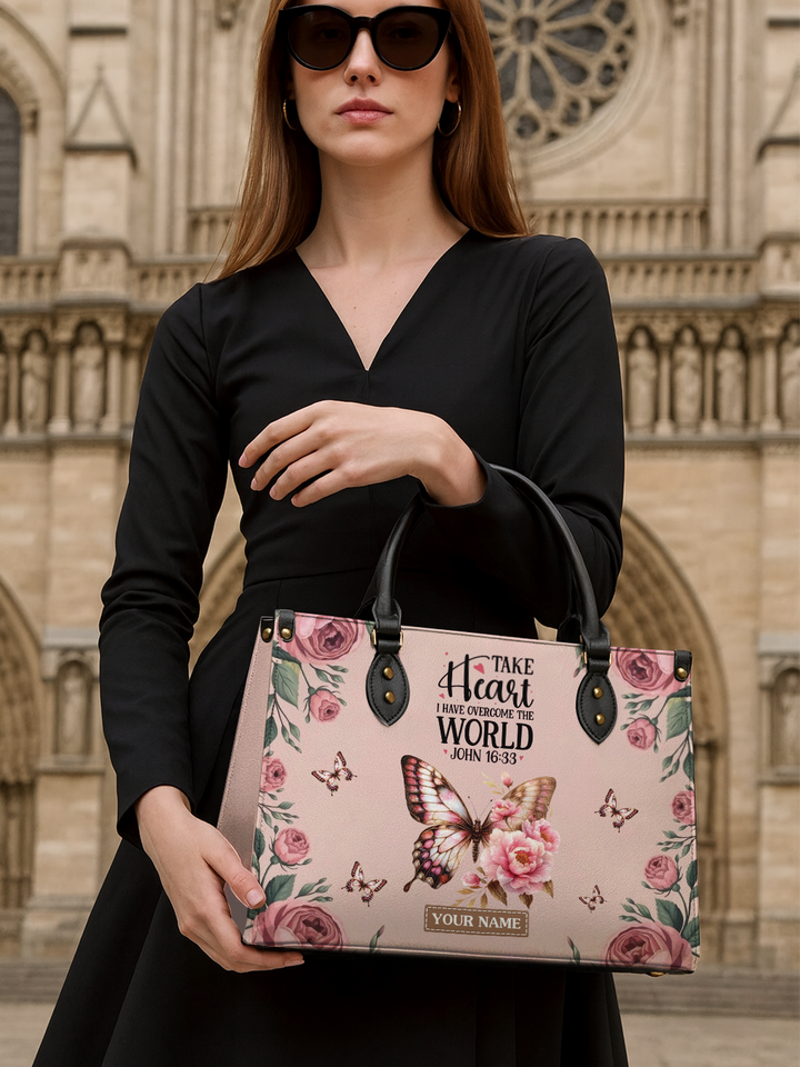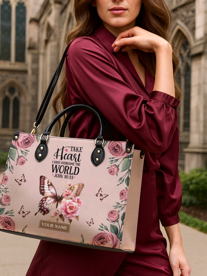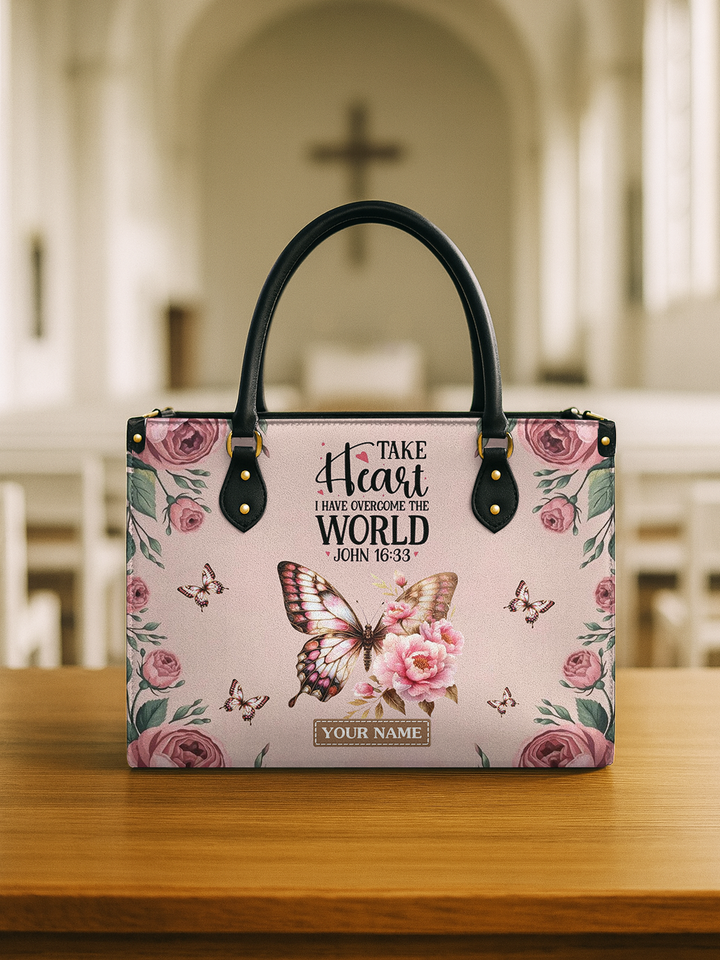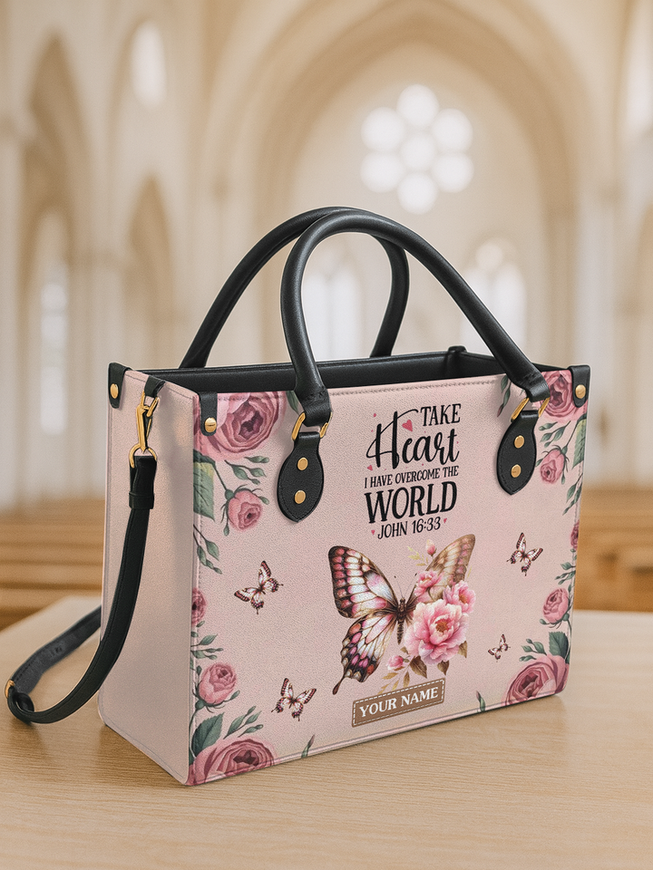 Find courage in Christ with the Overcomer Leather Handbag. Featuring blooming roses and graceful butterflies, the design highlights the empowering verse from John 16:33: