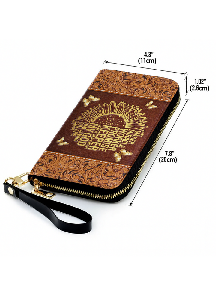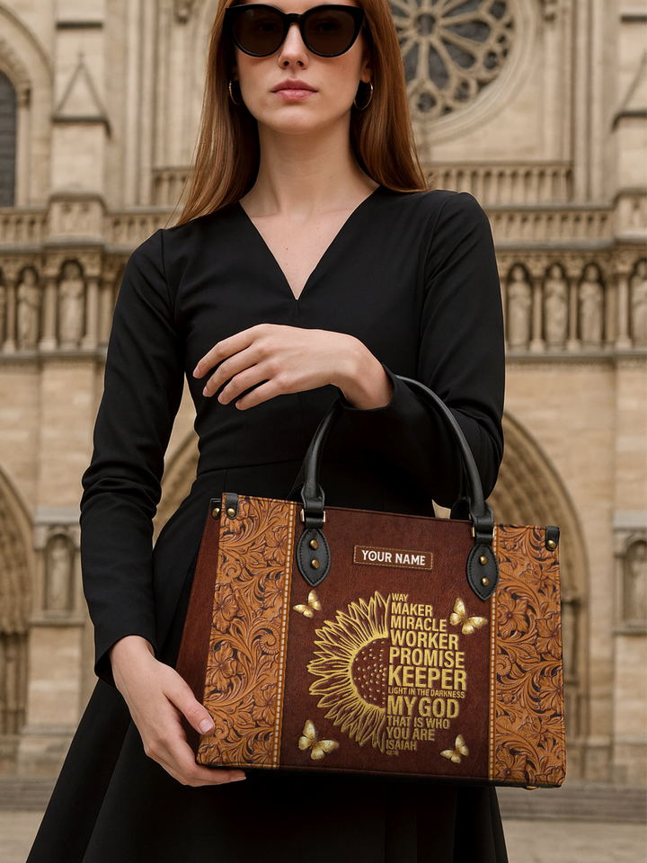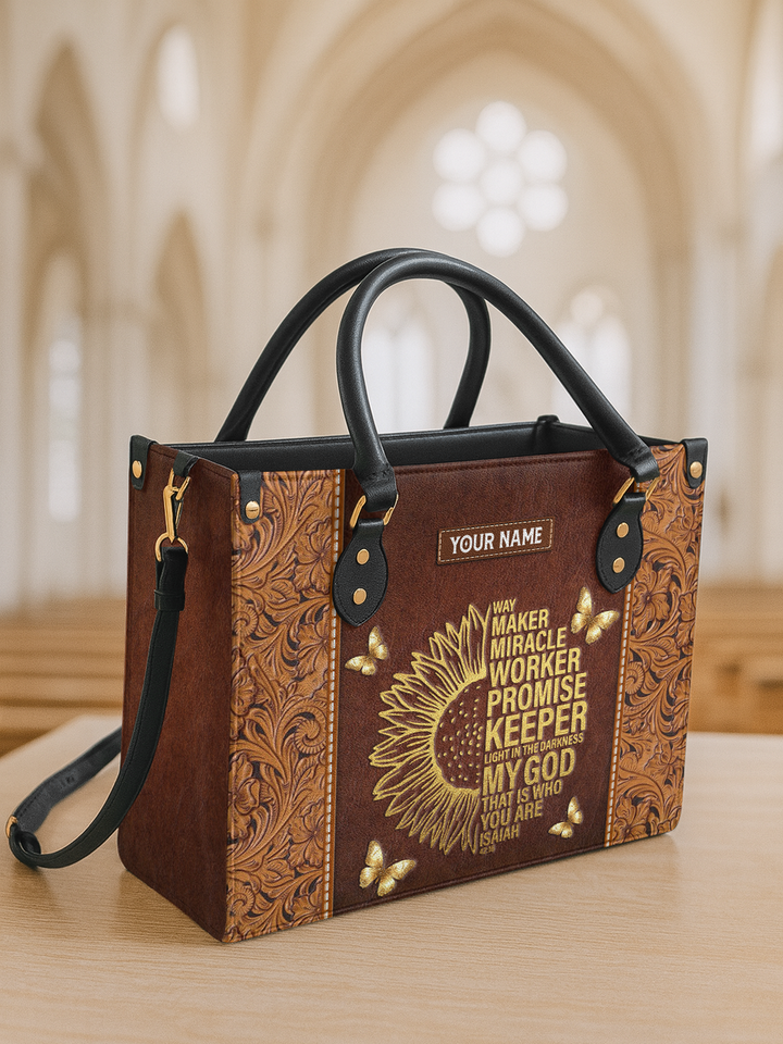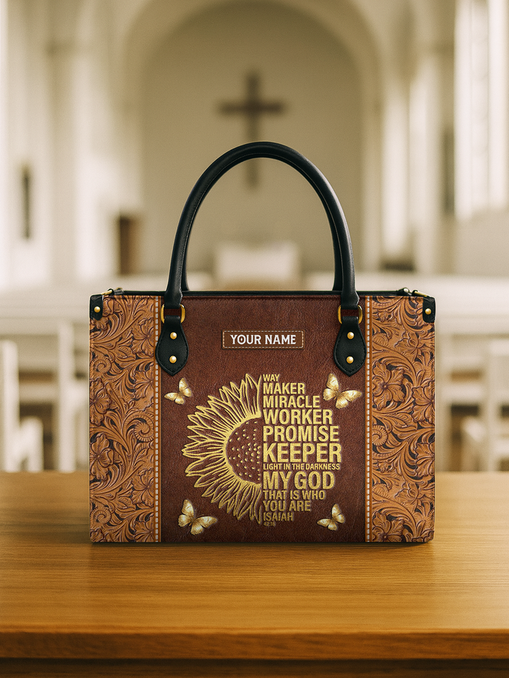 Shine with faith through the Promise Keeper Leather Handbag. Featuring a radiant sunflower and golden butterflies, the design carries the powerful words of Isaiah 42:16: