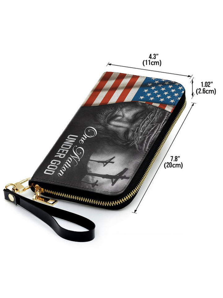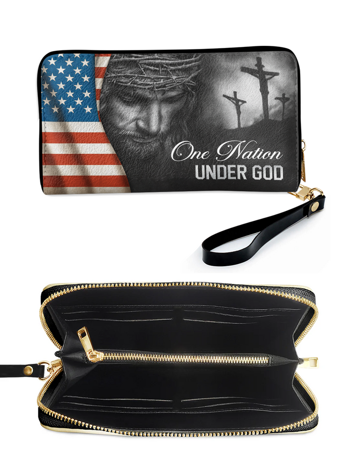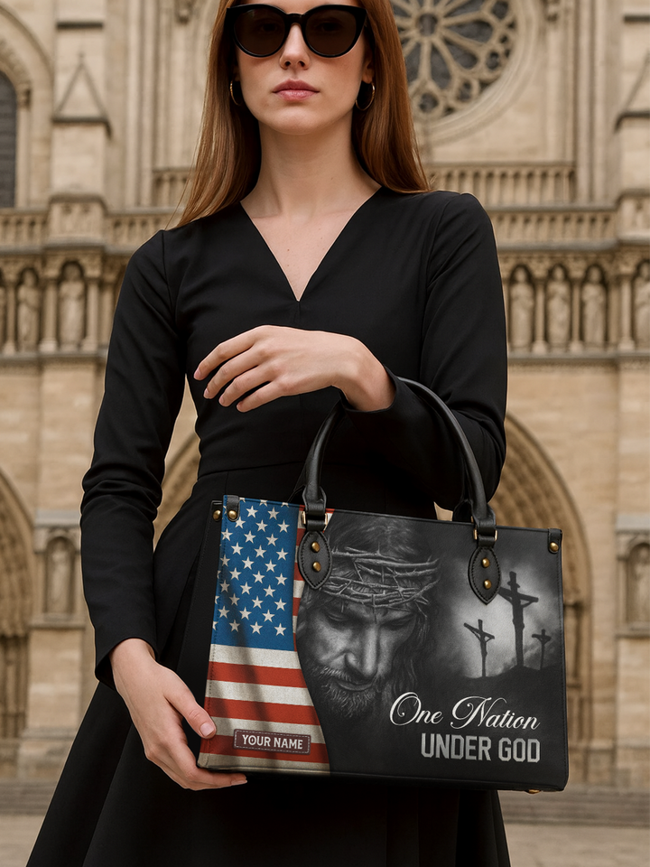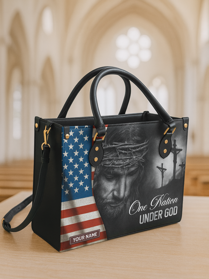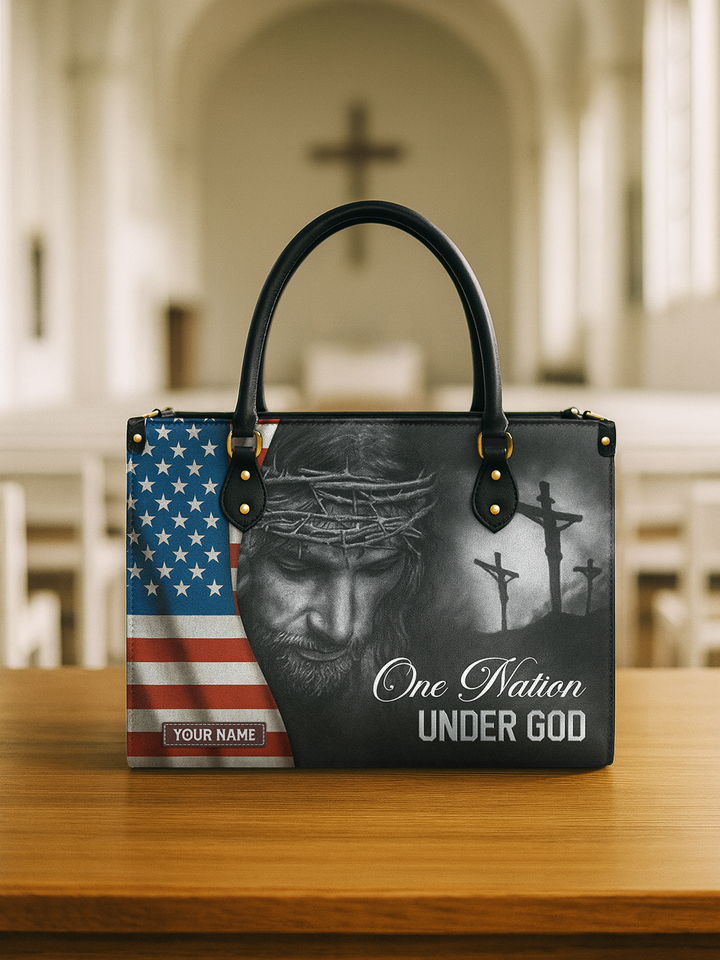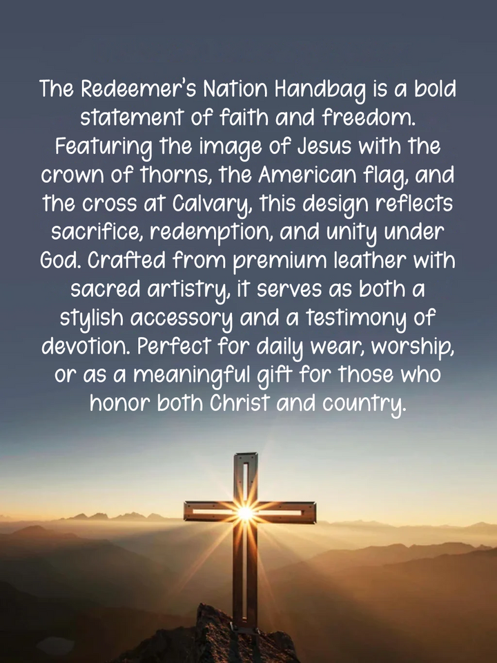 The Redeemer’s Nation Handbag is a bold statement of faith and freedom. Featuring the image of Jesus with the crown of thorns, the American flag, and the cross at Calvary, this design reflects sacrifice, redemption, and unity under God. Crafted from premium leather with sacred artistry, it serves as both a stylish accessory and a testimony of devotion. Perfect for daily wear, worship, or as a meaningful gift for those who honor both Christ and country.