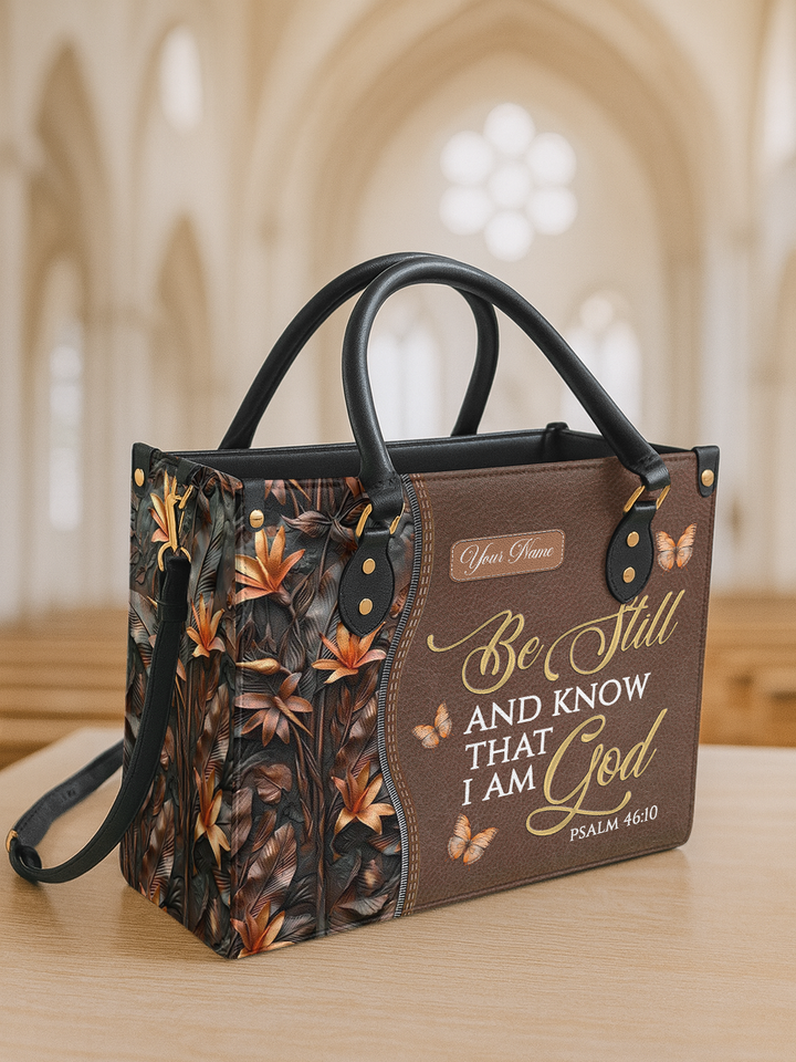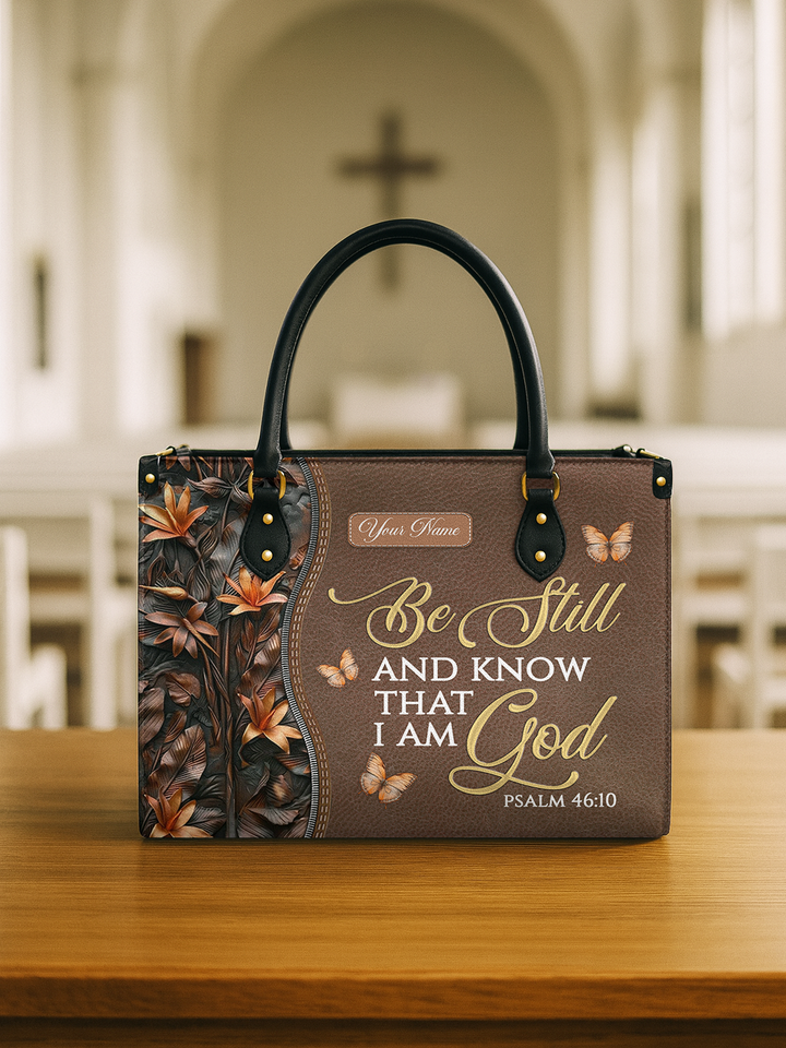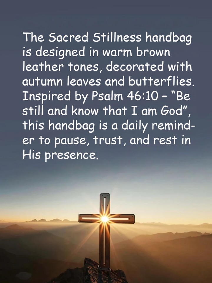 The Sacred Stillness handbag is designed in warm brown leather tones, decorated with autumn leaves and butterflies. Inspired by Psalm 46:10 – “Be still and know that I am God”, this handbag is a daily reminder to pause, trust, and rest in His presence.