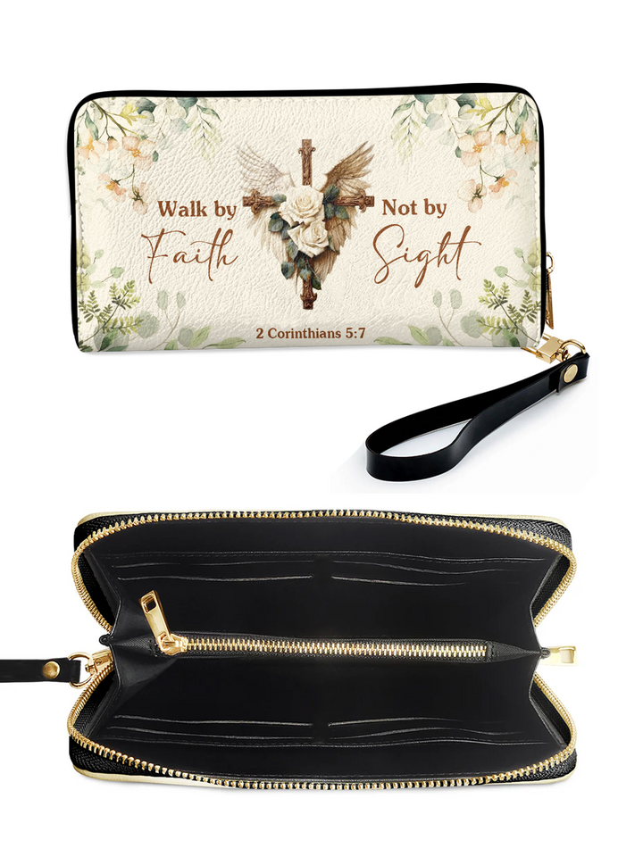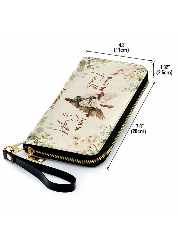 Carry a symbol of trust and devotion with the Walk by Faith Leather Handbag. Featuring a cross adorned with white roses and angel wings, the design highlights the scripture from 2 Corinthians 5:7:
